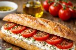 Bagheta o tai în două pe lungime, o ungi cu cremă de brânză şi aşezi salata. Pui feliile de mozzarella alternativ cu rondelele de roşii şi ornezi cu frunze de busuioc proaspăt.