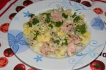 Fierbeti in apa si sare pastele respectand timpul de fierbere indicat pe cutie. Scurgeti pastele, pastrand putin lichid (100 ml) Prajiti intr-o tigaie wok incapatoare sunca taiata cuburi, usturoiul tocat. Adaugati pastele si smantana amestecand usor. Seviti preparatul asezonat cu...