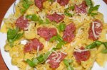 Fierbeti pastele in apa si sare ,,a la dente ''. Caliti usor salamul , sunca feliate , ardeii taiati cuburi si prazul maruntit in ulei . Turnati farfallele peste mezelul si legumele calite , adugati branza de burduf . Amestecati usor pana se incorporeaza branza si devine un...