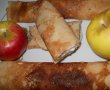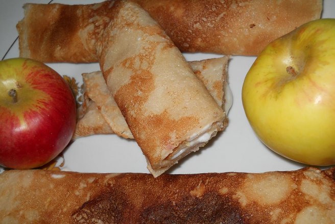 Merele le dam prin razatoare si le punem intr-o oala cu zaharul si batonul de scortisoara, amestecam si punem pe foc amestecand continuu, pana se inmoaie putin. Lasam sa se raceasca si adaugam peste aluatul de clatite si omogenizam.
