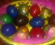se vopsesc ouale dupa instructiunile de pe vopsea, se pun la uscat apoi se ung cu ulei sau grasime.
