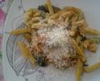 Taiem pieptul de pui fasii si dupa ce se fac dovleceii adaugam pieptul de pui si rosiile. Adaugam si pasta. Mai adaugam sare si piper (daca este necesar) si amestecam.