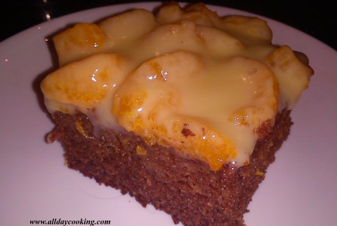 Cand am scos din cuptor prajitura, am turnat deasupra siropul de la compot si am asezat feliutele de mandarine.