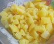 Curatam cartofii de coaja, ii taiem cuburi si ii punem la fiert in apa rece cu sare. Cand sunt gata, ii scurgem bine de apa si ii punem intr-un bol.