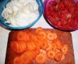 Amestecam de cateva ori apoi adaugam morcovul si apa calduta, apoi acoperim si lasam legumele la inabusit cateva minute, adaugam feliile de ceafa, usturoiul, asezonam cu sare asi condimentele si adaugam restul de apa.